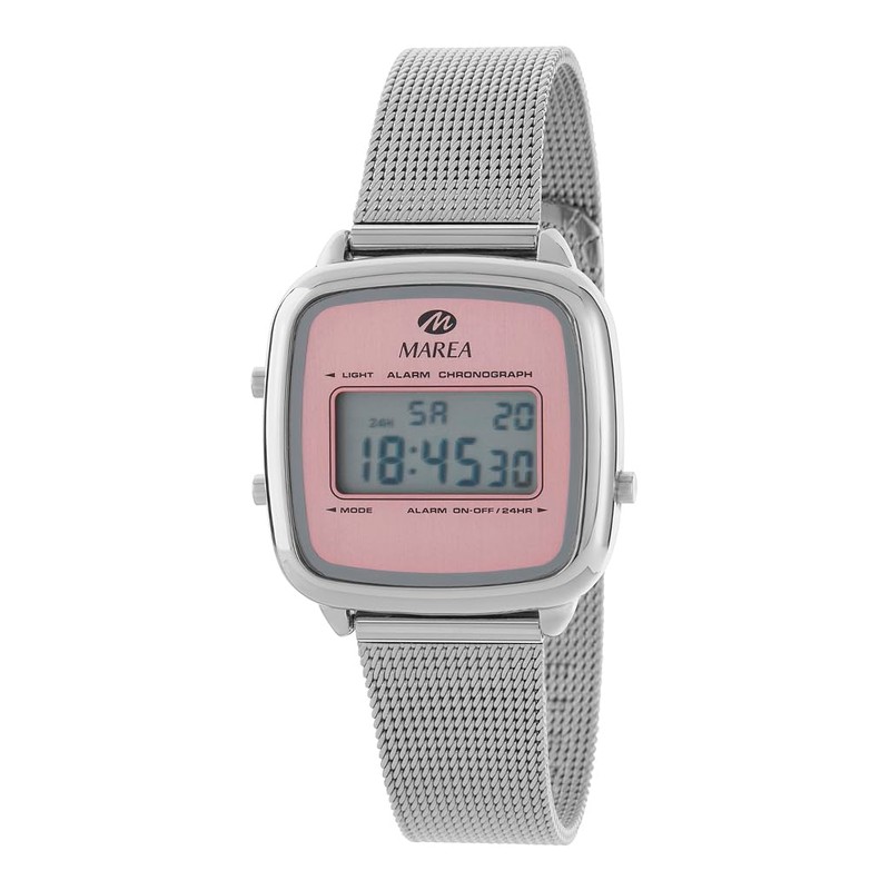 Marea B35363/2 Damenuhr, digital, LCD, Rosa, silberfarbenes Metallgehäuse, Armband aus Stahl, 3 ATM, Rosa, Modern