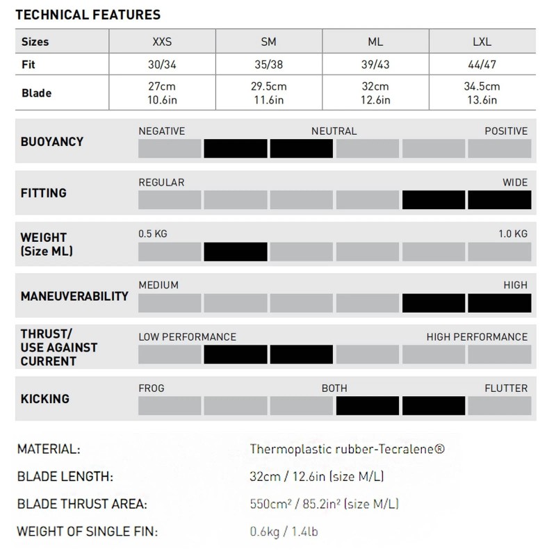 BI-MATERIAL OPEN HEEL DESIGN - Featuring a bi-material construction, these fins combine durability and flexibility. The design maximizes performance and comfort underwater, offering optimal propulsion without sacrificing the lightweight feel