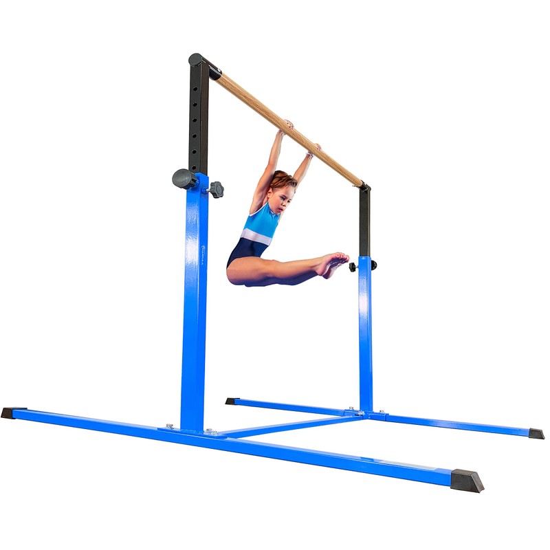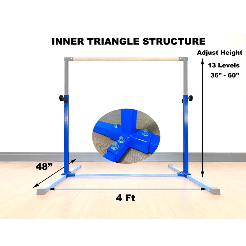 - 【ONE GYMNASTICS HORIZONTAL BAR FOR KIDS HOME USE】This type of gymnastics bar set is designed for kids who hope to improve their gymnastics levels. The height is adjustable from 36 inch to 60 inch, base length is 48 inch, inner width is 4 ft, we resell gymnastics air track mat to fit this bar, you could buy them in our store.