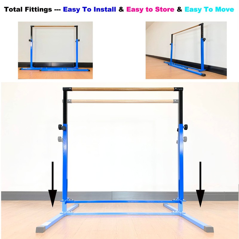 - 【PERFECT MATERIAL---More Safe & More Durable】 ※ Gymnastics bar Crossbar is made of fiberglass, compared with wood, it is more durable and flexible, kids have a professional feeling as competition. ※ Structure is made of heavy duty steel, and surface treatment is high quality Powder coated, Protect the main structure from corrosion