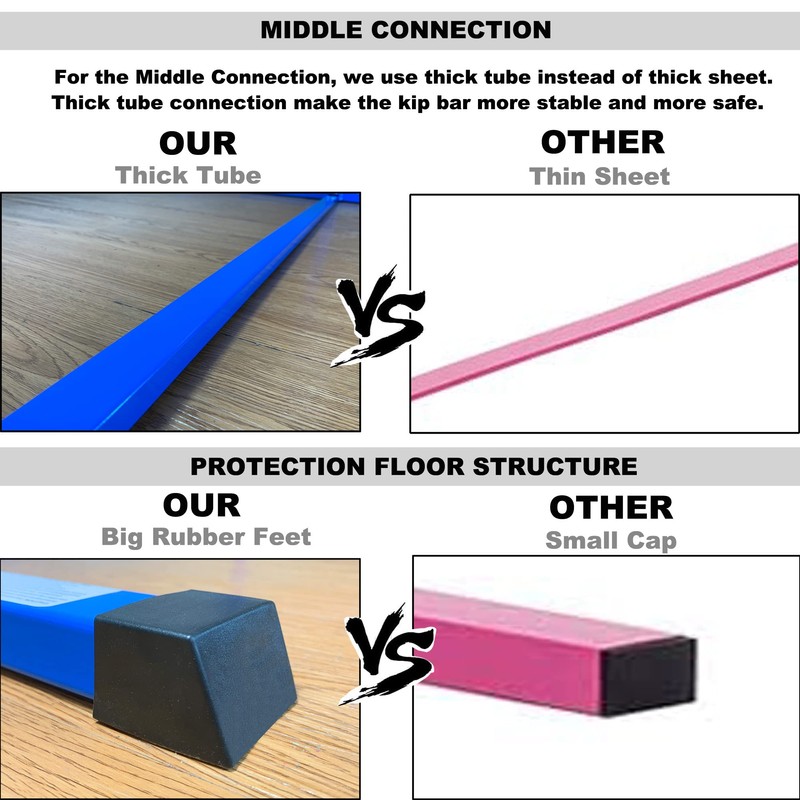 - 【IT IS ONE SAFE & STABLE KIP BAR GYMNASTIC BAR FOR KIDS】For this type of gymnastics bar set, there are two knobs, one is locking knob and the other is spring knob, give kids double safety. And instead of rubber cap, we use rubber feet to increase the whole stability of the kip bar set. THIS BAR IS WITHOUT MAT