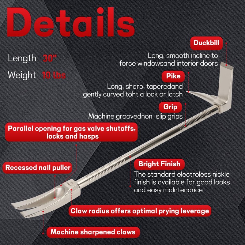- Designed for Ultimate Durability:30" Halligan forcible entry tool is constructed from a low-carbon, 45-gauge alloy steel material that provides unmatched toughness. Rigorous heat treating process provides added strength to the Halligan entry tool. Halligan entry tool has been crafted to provide professionals with superior control and efficiency