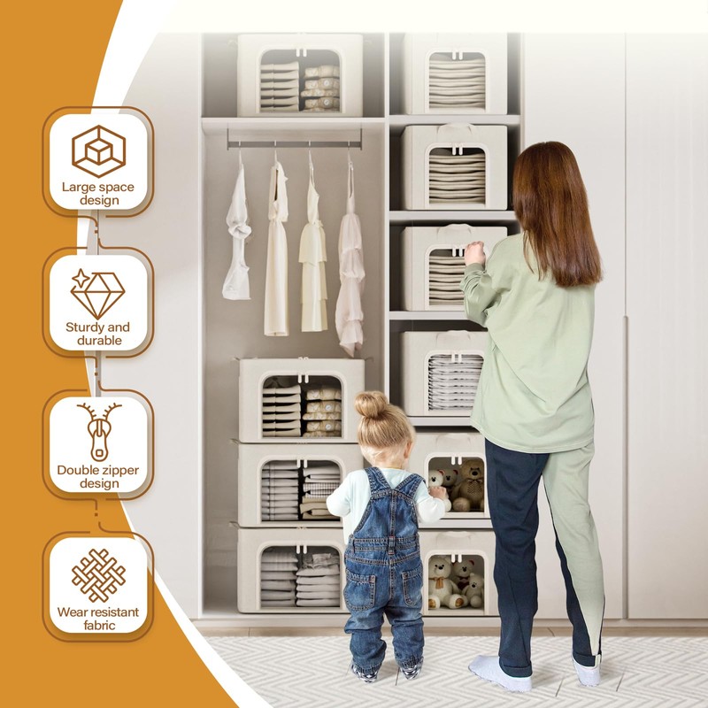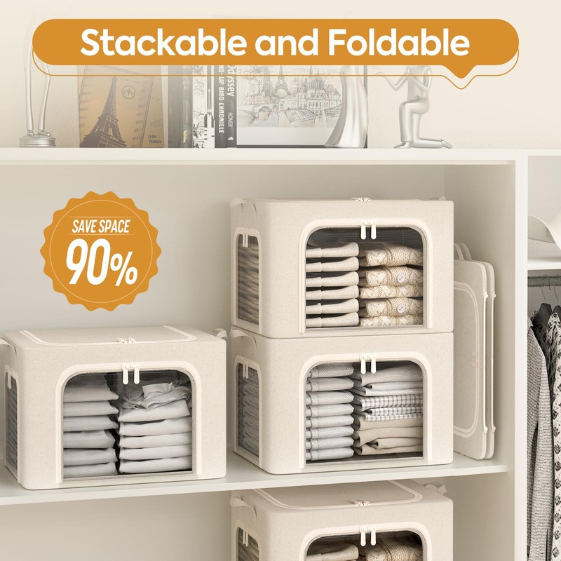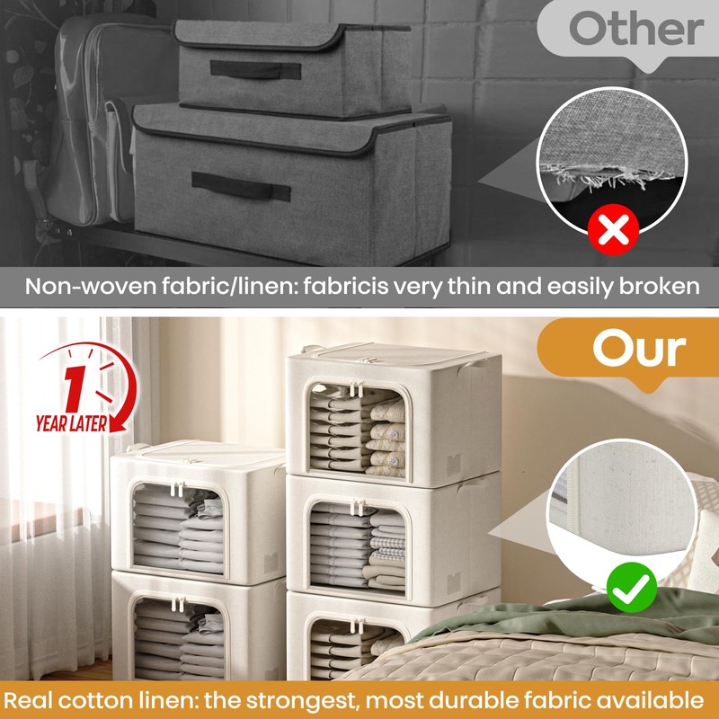 - 🌿 Natural & Sturdy Fabric | Crafted from premium cotton-linen blend fabric, reinforced with a rust-proof metal frame for enhanced durability. Naturally dustproof and moisture-resistant to protect sweaters, delicates, and seasonal items.