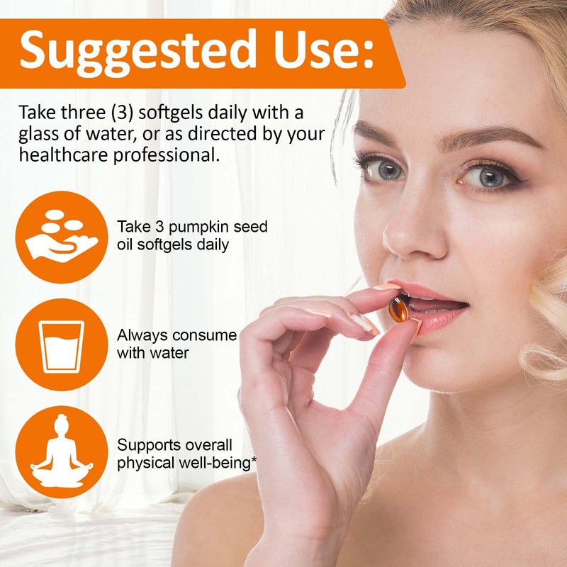 - Usage: Take 3 Pumpkin seed oil capsules per day, 300 capsules (100 days of use), low daily cost; small soft capsules are easy to swallow and have no fishy smell. It is recommended to take with warm water, suitable for long-term use, and does not contain soy, nuts, or dairy products, so it can be consumed by all adults with needs