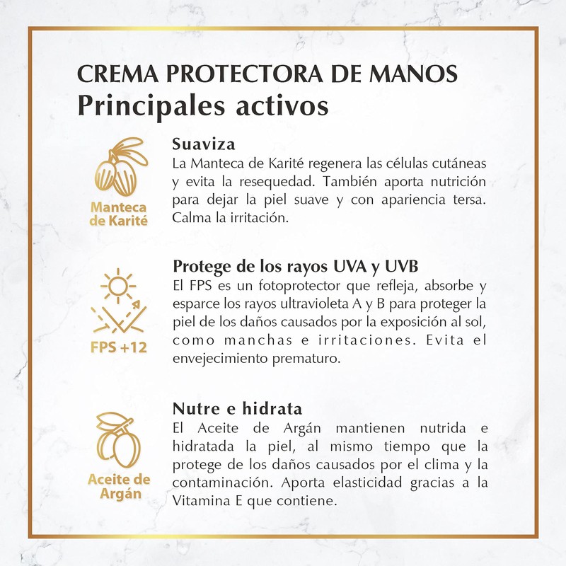 • BENEFICIOS. Loción: Una piel hidratada, con apariencia joven, firme y protegida de los daños causados por la contaminación y el clima. Crema manos: Manos protegidas de los daños causados por la exposición solar, como manchas y arrugas. Piel nutrida y con apariencia joven desde las primeras aplicaciones. No deja sensación grasosa.