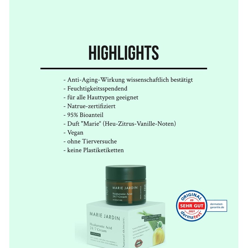 - Face cream for all skin types: suitable for both normal and dry as well as for sensitive, sensitive, blemished skin or combination skin types. Ideal for combining with the vitamin C serum from Marie Jardin. The hyaluronic acid moisturiser is suitable for men and women alike.
