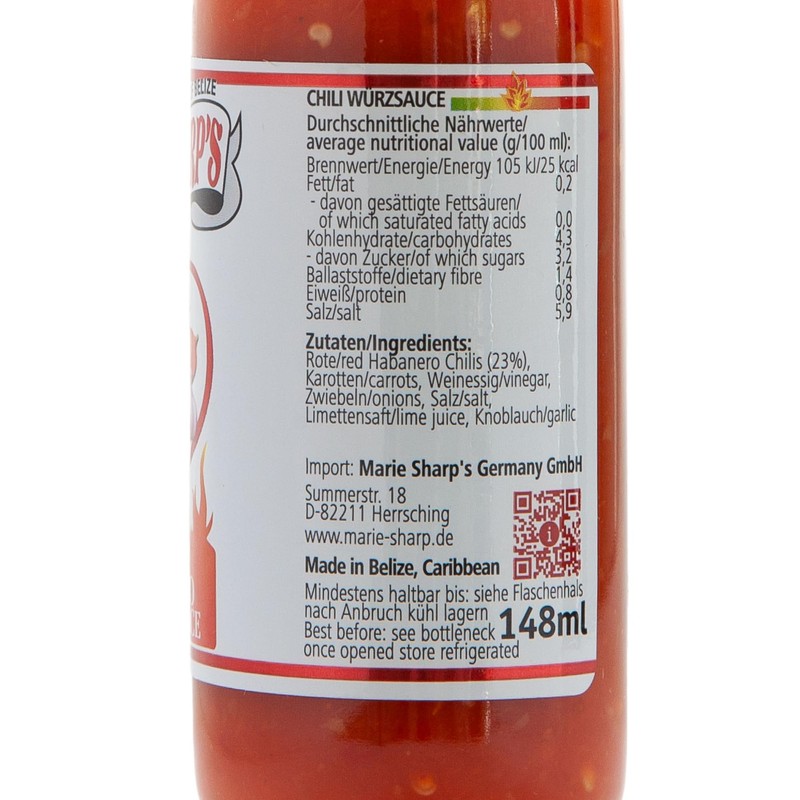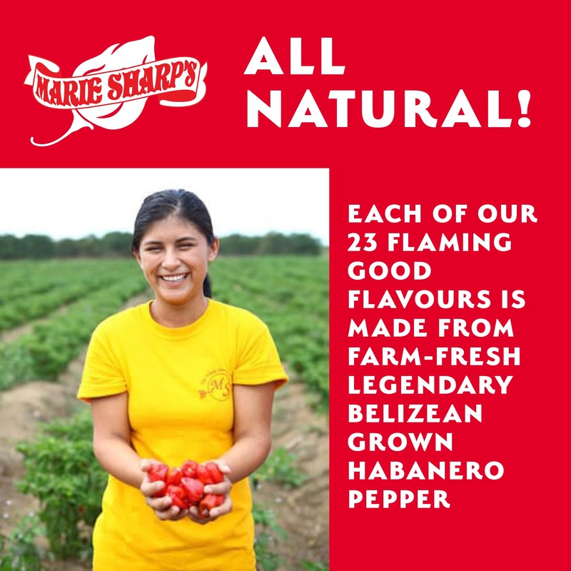 Marie Sharp's hot Habanero pepper sauce's a perfect balance between flavor and heat. Marie achieves the wonderful, complex flavors by using only the freshest ingredients. A great table sauce that will have you coming back for more. Nestled in the foothills of the Mayan Mountains, Marie Sharp's factory still creates products the old fashioned way: using the freshest vegetables and the finest ingredients. Her secret homemade recipe utilizes the potent red Habanero pepper. Produced in the fertile paradise of Belize. Marie has spent many years cultivating a Habanero worthy of her recipe. She has succeeded.