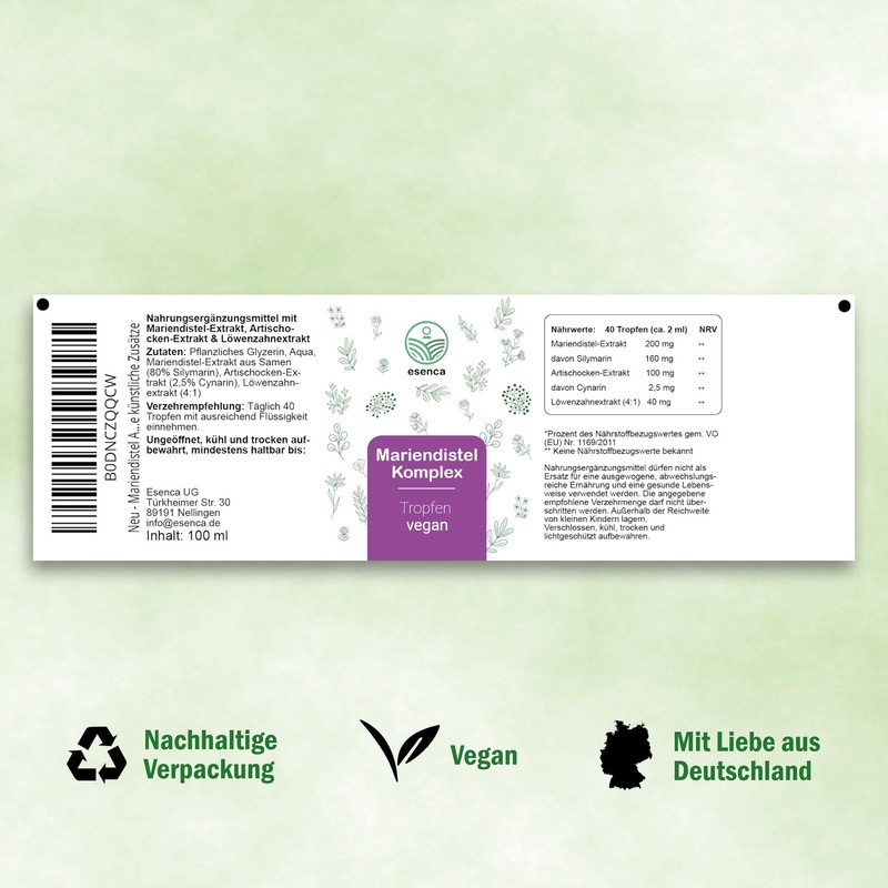 - Hochdosierter Mariendistelextrakt: Enthält 80% Silymarin, bekannt für seine starke antioxidative Wirkung und seine Unterstützung der natürlichen Leberregeneration.