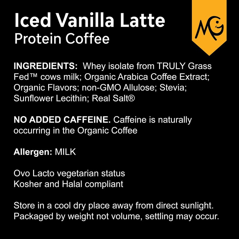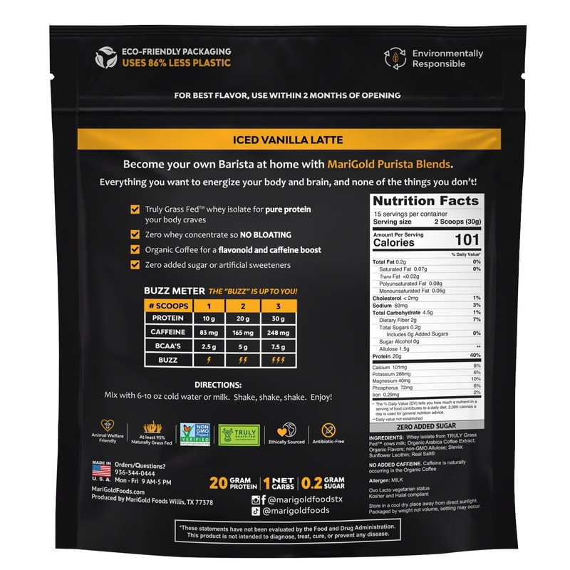 MariGold MariGold High Protein Coffee - Iced Vanilla Latte, 20g Grass-Fed Whey Protein Isolate, Energy & Workout Boost, 2 Shots Organic Espresso, Non-GMO, 1 Net Carb, 1 Lb Bag, 15 Servings