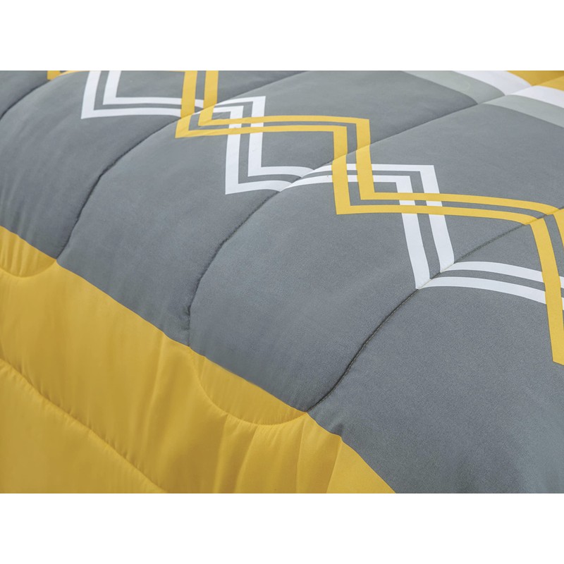 - Design and Feature: This Modern Design have Grey and Yellow Base with White and Yellow Chevron Wave and Yellow Stripes Decorated on It. Marina Decoration Goose Down Alternative Bed in a Bag BIAB Rich Printed Comforter Set. The Comforter is Oversized and Overfilled. Box-Stitching Design to Avoid any Shifting in the Comforter. Sheet is Packed into Separated PVC Bag