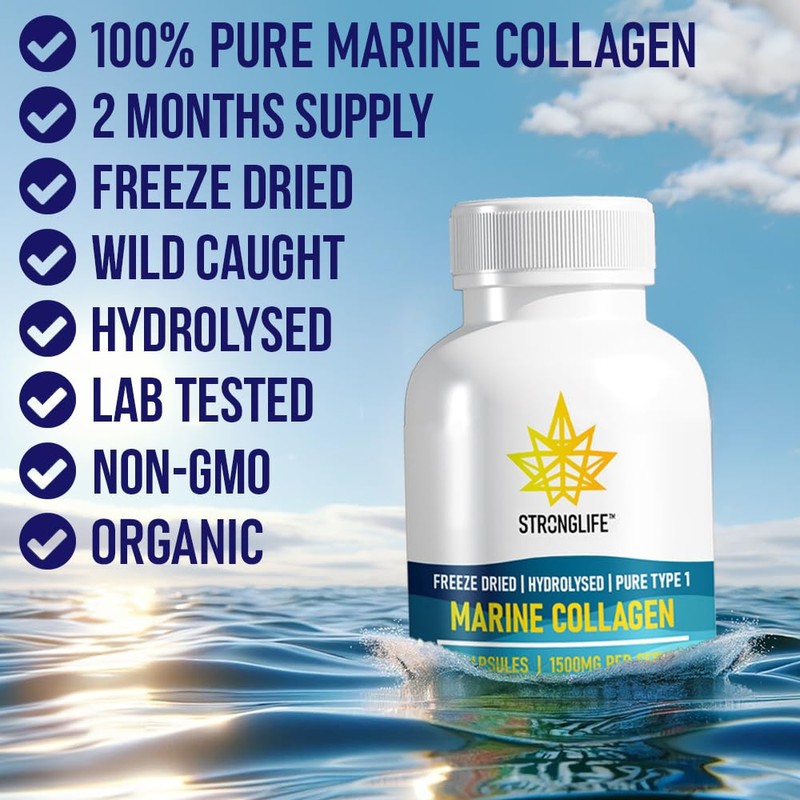 - Stronglife Marine Collagen Hydrolysed Peptides Capsules: Collagen is crucial for maintaining the structure of skin, joints, bones, teeth, and muscles. With aging, our natural production decreases. StrongLife Marine Collagen Capsules offers high-quality 120 hydrolysed Peptide Type 1 collagen capsules from Wild Caught fish, offering a powerful boost to your beauty and health regimen. Convenient alternative to collagen powder, providing the essential support your body needs.