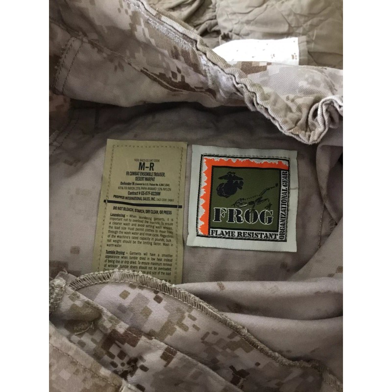 Marine Corps Desert FROG Combat Set Size Medium Regular New without tags, combat shirt and trousers both size medium regular never worn or fielded. Military. Usmc. Marines. Tactical. Uniform. FR. Flame resistant organizational gear.