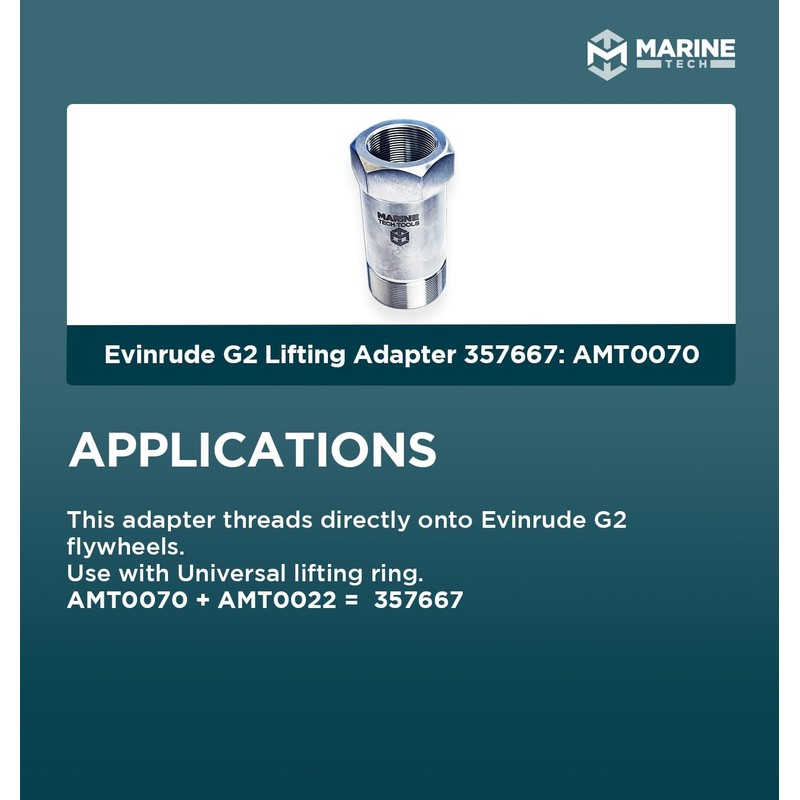 - 👍 INCLUSION & COMPATIBILITY — This lifting adapter bolts directly into Evinrude G2 flywheels (AMT0070). Designed to fit with our Marine Tech Tools Universal Lifting Ring (AMT0022). It's the best adapter system for mounting Evinrude outboards. The Evinrude G2 lifting adapter combined with AMT0022 threads into the flywheel of the motor for lifting BRP equivalent part number 357667