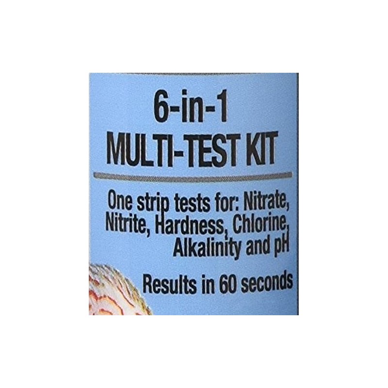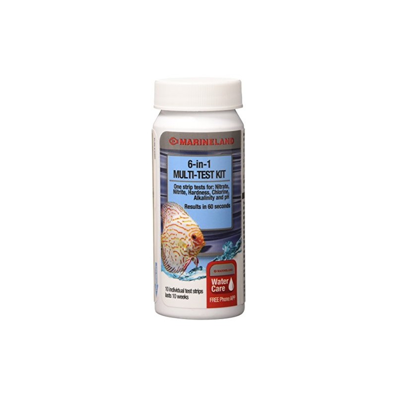 - Marineland 6-in-1 Multi-Test Kit tests for nitrate, nitrite, hardness, chlorine, alkalinity and pH
