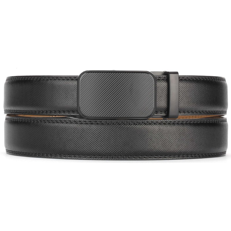 - EASY USE — Just slide the dress belt into the sliding buckle and pull the ratchet belt through, the nice belts buckle simply auto locks the automatic belt, to release the belt, gently push the lever on the side of the removable buckle and lock will snap. Simple, smooth and sleek!