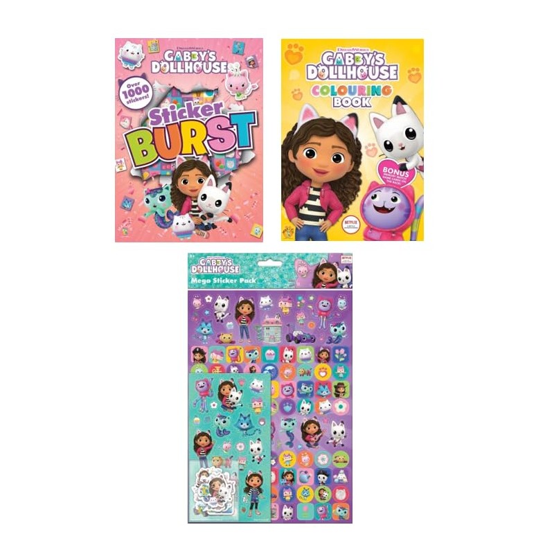 - Gabby's Dollhouse Sticker Burst - The book contains 24 pages filled with a variety of fun activities. These activities include colouring pages, mazes, puzzles and over 1000 stickers.