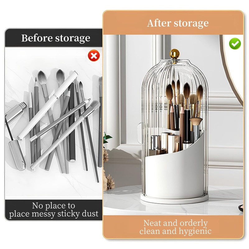 The open compartment design allows you to easily store makeup brushes. It meets your requirements for storing various makeup brushes and lipsticks: cosmetic boxes, dressing table storage boxes, desk storage boxes, bathroom storage boxes, etc. You can also place the box next to the mirror, in the bedroom or even under the sink to quickly find your makeup brushes. The dust and waterproof function protects your brushes from dust and water.