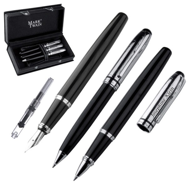 - 3-piece Mark Twain metal writing set consisting of a fountain pen including converter (refillable cartridge), a ballpoint pen with black writing metal large capacity refill and a blue writing rollerball. All this in a beautiful box with white stitching. We engrave all three writing instruments