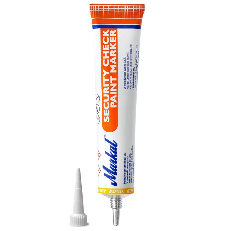 - Markal Security Check ペイントマーカーは、安全関連ファスナーの緩みを即座に検出するトルク緩みインジケーターとして使用されます。 ノンドリップフォーミュラは、緩めるとボルトのねじ山や亀裂に簡単に適用されます。