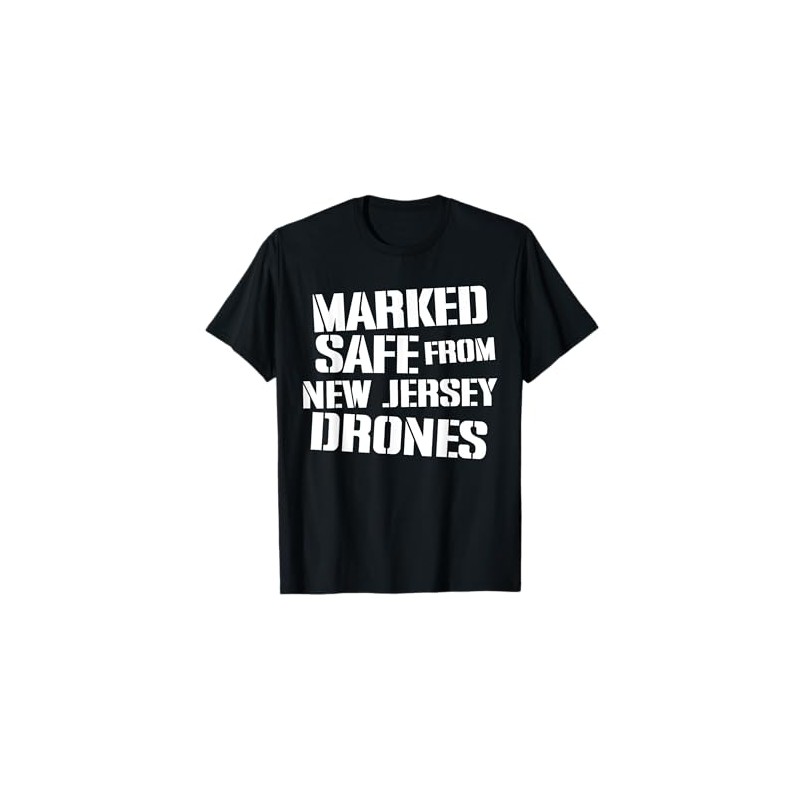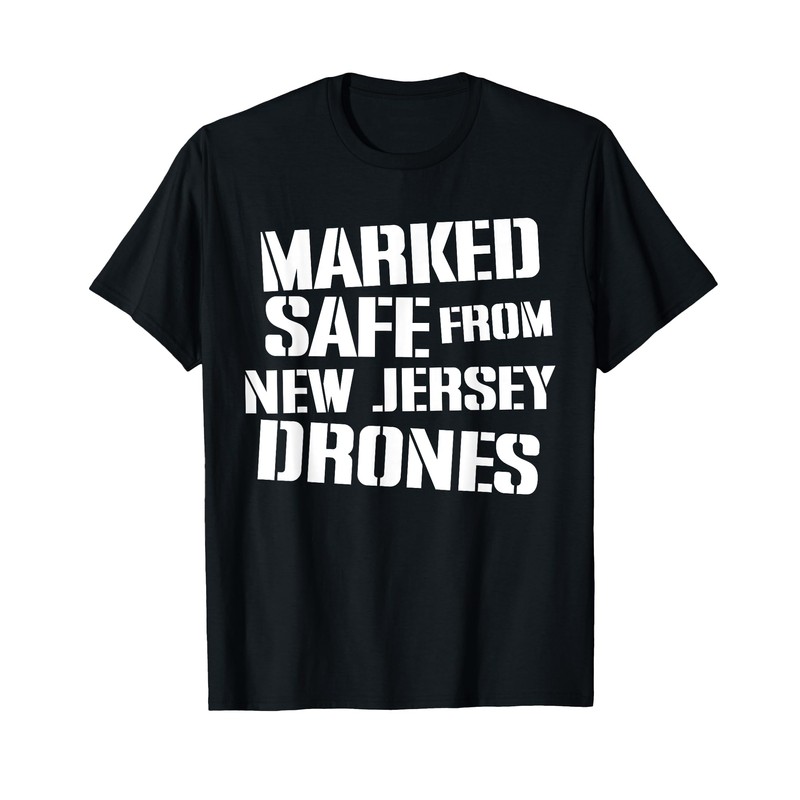 - This funny mystery drone design shows: Marked Safe From New Jersey Drones. Let everyone know you're safe from the New Jersey drones with this funny conversation design.