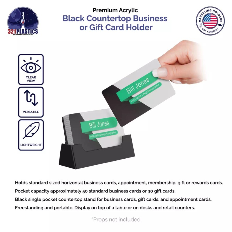 This black freestanding business card holder is designed to hold and display business cards, gift cards, appointment cards or any other 3.5”W x 2”H printed material. Made of durable plastic acrylic, the card holder can be conveniently placed on desks, tables, retail counters or anywhere you want to leave your cards for customers to take one.
