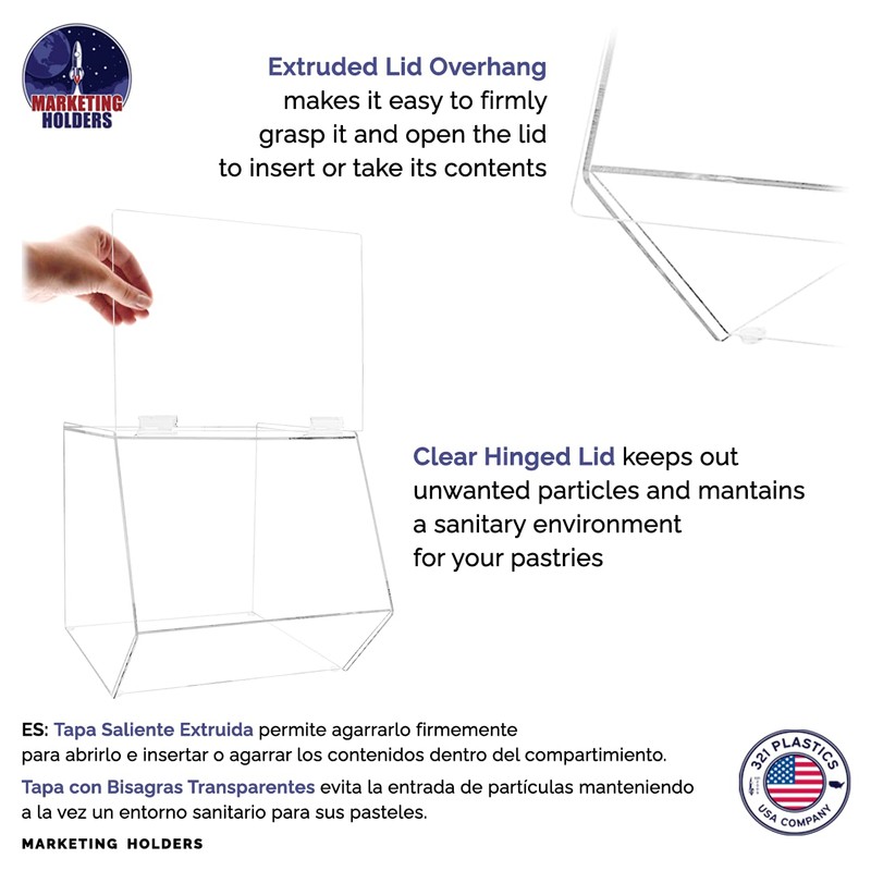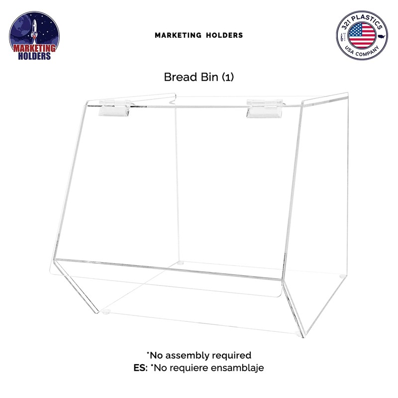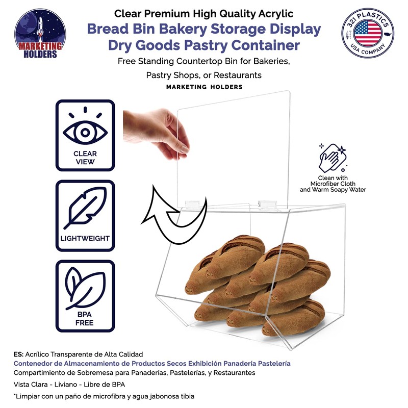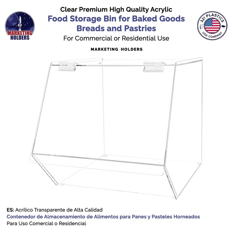 - Marketing Holders storage bins are made from high quality, durable, clear acrylic. This bread bin features non-skid rubber feet on the bottom to protect surfaces from damage and keeps the container in place while in use. This plexiglass caddy comes with a hinged lid that keeps out unwanted particles. Our bins are the perfect solution for storing and displaying a variety of breads, pastries, baked goods and other food items.