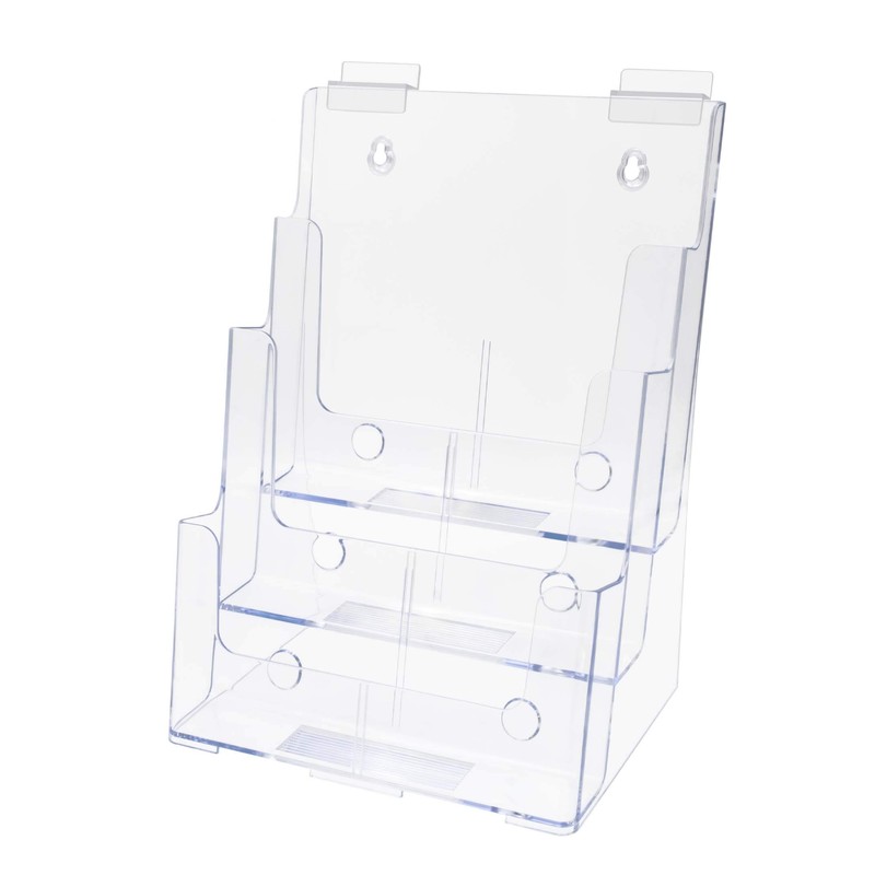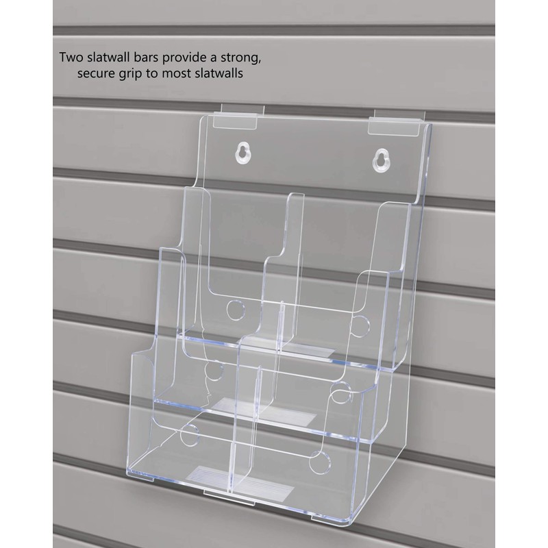 This slat wall tri fold brochure holder is the perfect solution to display and organize promotional literature while providing brochures, pamphlets, rack cards and flyers to prospective customers for the taking. Made of durable clear acrylic, the brochure holds your 4”W advertising and marketing material. Great slat wall mount brochure display for offices, stores, hotels, trade show booths and more.