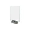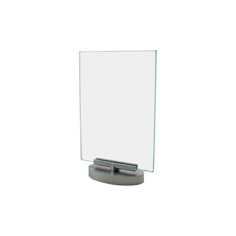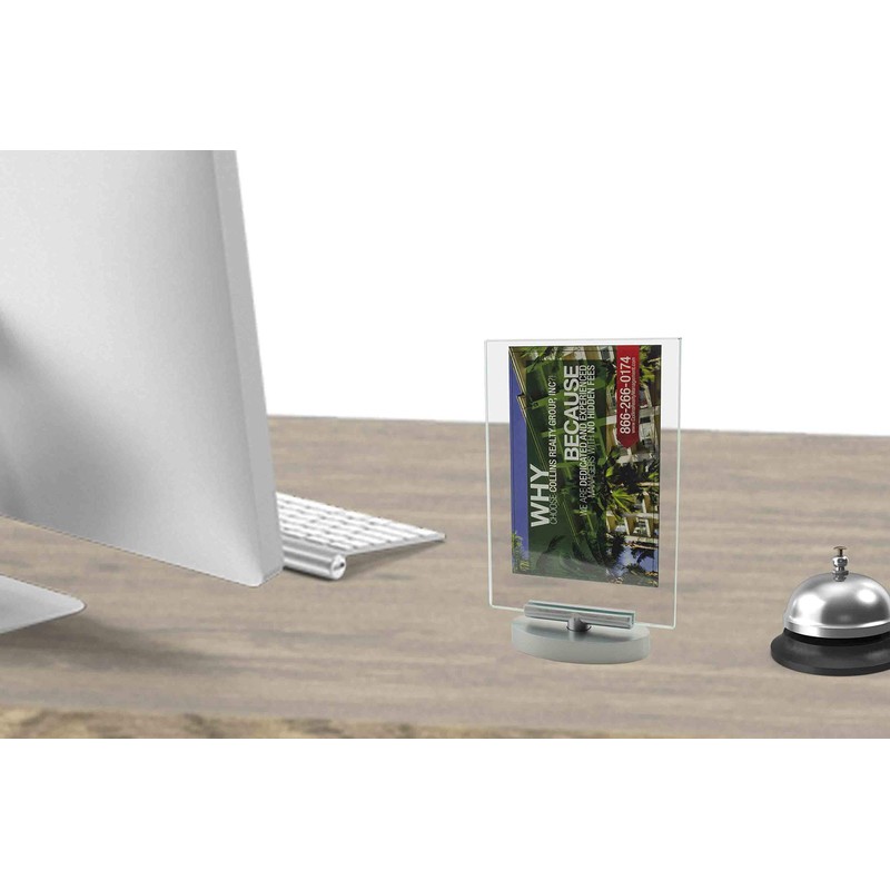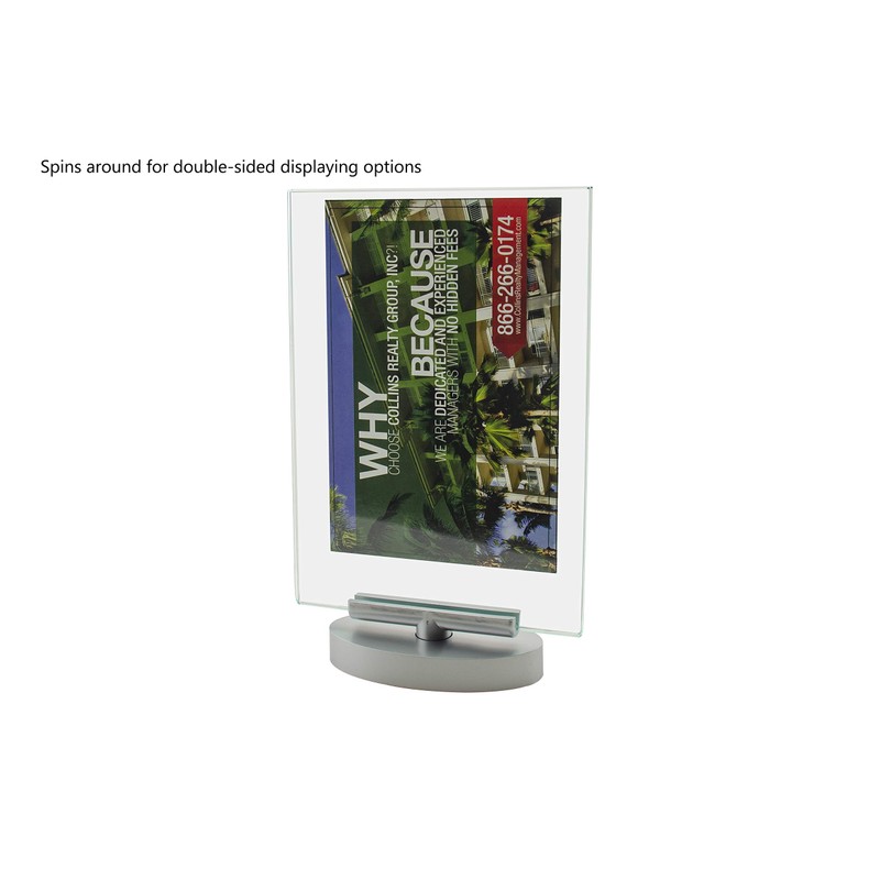 - Holds 5"W x 7"H literature Overall Sign Holder Dimensions: 5"W x 8"H x 2"D with a 3.75" Base. *All sizes are approximate Premium Rotating Countertop Sign Display Holder with Green Edged Acrylic and Brushed Silver Colored Base Display on desks, tables, and counters at events, in restaurants, bars, retail stores, trade show booths, hotels and other business locations. Top load makes sign changes quick and easy