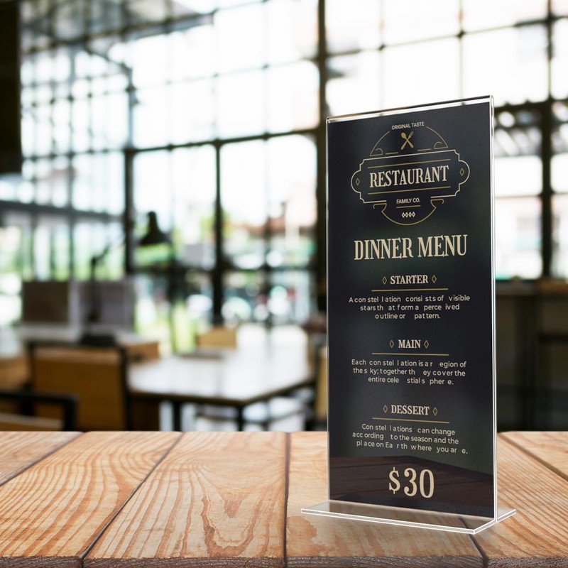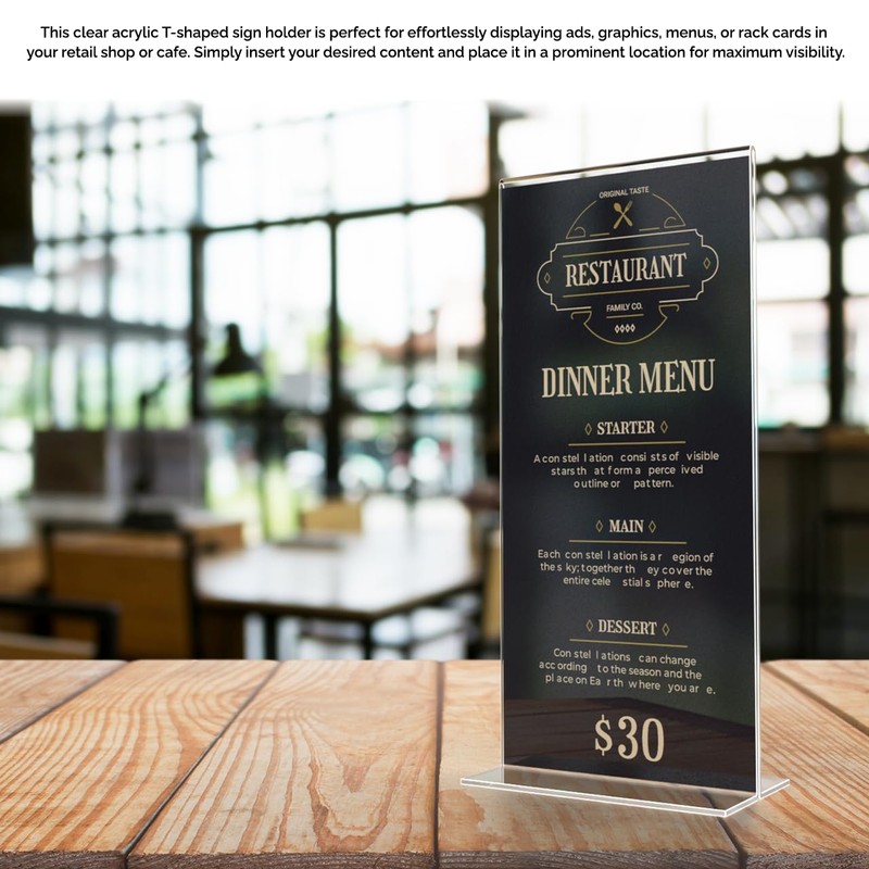 4 Pack Sign Holder 4"W x 9"H Double Sided Bottom Load Table Tent Product Features: Holds 4”W x 9”H literature. Overall Dimensions: 4”W x 2.75”D x 9”H . Thickness: 0.080, 2MM, 5/64". Perfect countertop display frame for advertisements, menus, pricing, POP signs and more. Bottom-loading makes sign changes quick and easy. Proudly made with premium high quality plastic. Tired of walking into professional business, shops or restaurants and seeing paper signs taped to the wall? Don’t be that person, how tacky! This freestanding T Shaped sign holder is perfect for displaying advertising, graphic images, or printed media that you would like to have on display in your retail shop, cafe or office. Use these holders to inform your customers or clients about hours of operation, today's specials, ads and advertisements or general informational notices. These versatile sign displays hold two images sandwiched back to back for dual sided viewing. These tabletop sign holders can be used practically anywhere, from trade shows to conventions or any other events. They are easy to use, simply slide your paper sign graphics flier or any other printed literature anywhere you want the general public and or office staff to see them. These are made to use over again. The light acrylic material is highly durable. Our products can be and have been purchased for businesses like professional offices, retail stores, medical facilities, apartment buildings, schools, and government buildings. Easy to use, easy to clean – each holder has an opening to easily insert advertisements and any other kind of information that you want to display. Done with them for now? Just wipe clean with a soft cloth and store until next time! These holders ensure that your graphics stay clean and viewable. *All sizes are approximate
