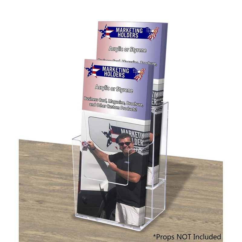 - 2 pocket tiered counter or hanging display stand for trifold brochures, pamphlets, takeout menus and flyers. Proudly made with premium high quality materials Marketing Holders multi pocket literature holder provides a simple yet effective tabletop or hanging display for pamphlets, brochures, rack cards and flyers. Use these holders to inform your customers or clients about hours of operation, today's specials or general informational notices.