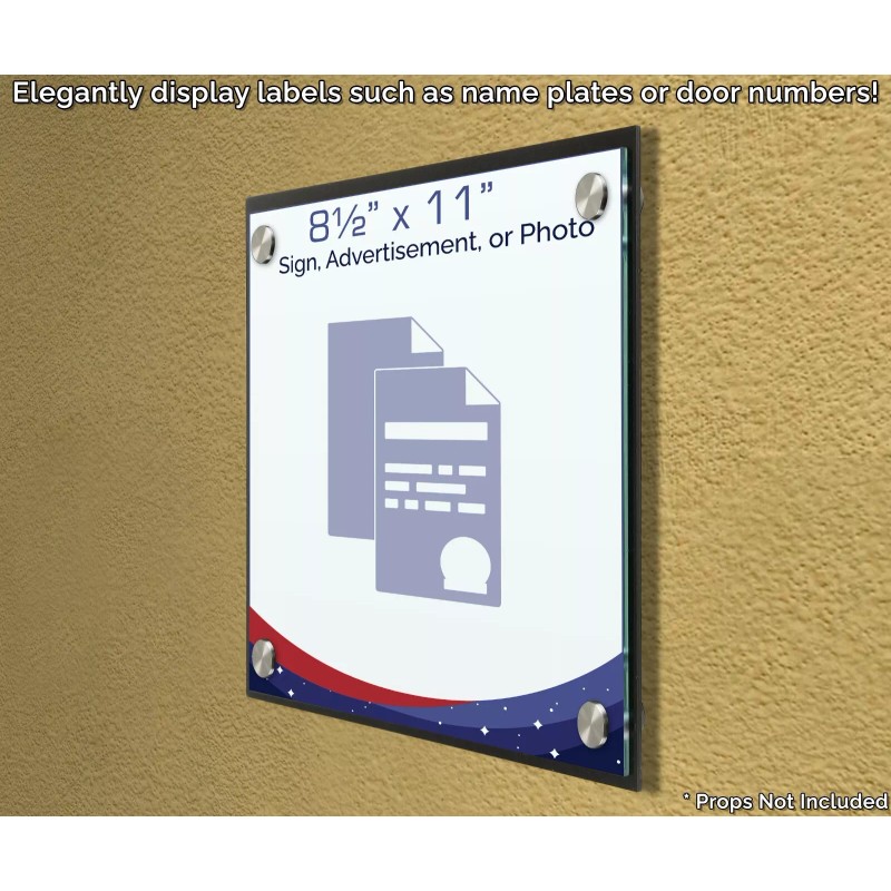 These acrylic wall mount sign holders add elegance to your professional environment with acrylic wall mount frames with silver standoffs. Frames can be used vertically or horizontally. The back acrylic plate is slightly larger than the front clear acrylic plate. When installed the display will stand away from the wall, giving the display a stylish contemporary appearance.