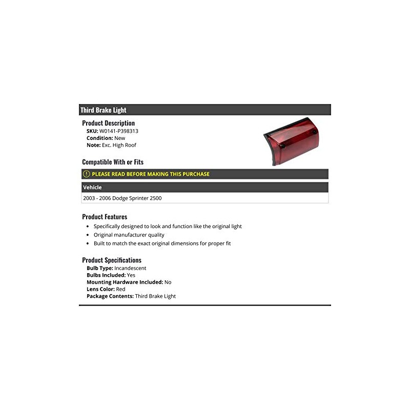Marketplace Auto Parts 3rd Third Brake Light Lens - Stop Lamp - Compatible with 2003-2006 Dodge Sprinter 2500 (Except High Roof)