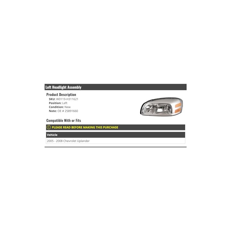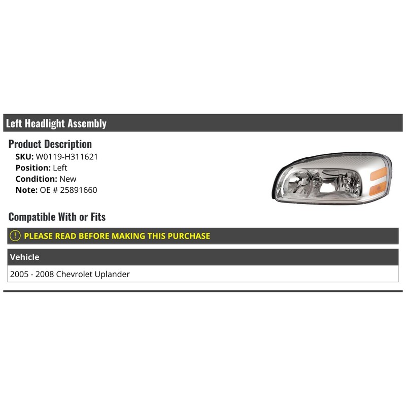 Left Driver Side Headlight Assembly - Compatible with 2005 - 2008 Chevy UplanderPosition:LeftNote:OE # 25891660Compatible With or Fits:2005 - 2008 Chevy Uplander