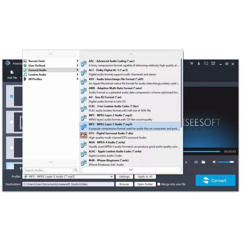 Supported output formats - AAC, AC3, AIFF, AMR, AU, FLAC, M4A, MKA, MP2, MP3, OGG, WAV, WMA