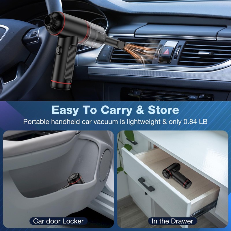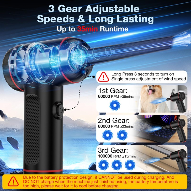 - Adjustable 3 Wind Speeds & LED Light: The air blower is equipped with a 100000 RPM powerful motor, which provides 3 levels super airflow for deep cleaning. Simply press and hold for 3 seconds to power on and off( the power CANNOT be turned on while charging), and a single press to switch between different wind speeds. In addition, the LED lights will automatically illuminate when turned on, allowing you to easily clean up dark corners, bringing great convenience to your cleaning