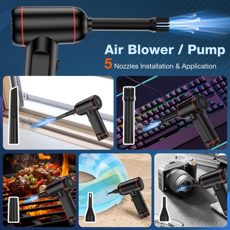 - Variety of Accessories & Multi-use Available: The compressed air duster is equipped with 5 different nozzles, 3 brushes, 2 vacuum accessories, and a HEPA filter, which suitable for different cleaning demand. This mini air blower cleaner not only cleans crumbs, hair and dust from keyboards, small corners, but it can also air up PVC swimming pools and blow up fires on the barbecue. With multiple accessories to choose from, you can use it in any combination you need to make cleaning easier