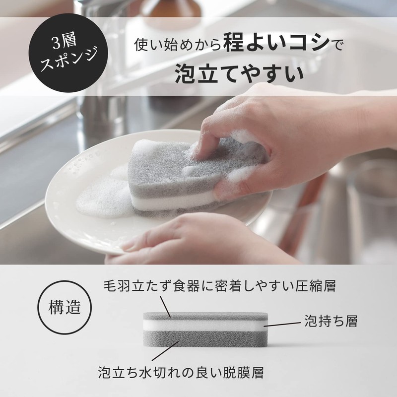 - (3-layer construction for thorough washing) The compressive layer makes it easy to stick to dishes without fuzzing, and the release layer of foam drains, and the 3-layer structure is sandwiched with a foam layer