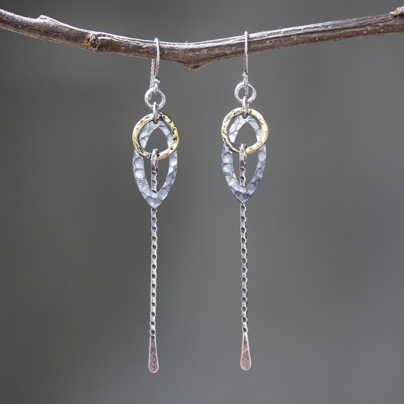 Marquis silver hammered texture earrings with brass circle and silver sticks on oxidized sterling silver hooks