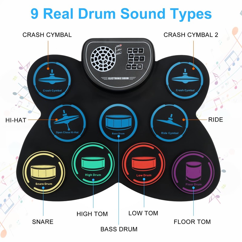 - Pads Portable Electric Drum Set: Marrilley electronic Drum Set contains all the drums you need to get started: Toms, Crashes cymbals, Hi-hat, Ride cymbal, SNARE, Bass drum. Foot Pedals play the sound of Bass Drum.This roll-up drum kit offers Timbres, DEMO Songs and Rhythms,Perfect for professional and beginner