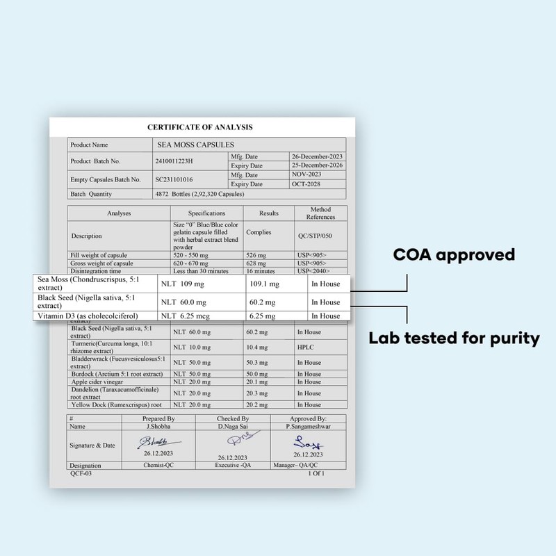 - Nutrient-Rich Sea Moss Capsules : Sea Moss Capsules are formulated to deliver these vital nutrients, supporting various bodily functions including thyroid health, digestive support, and skin nourishment. Incorporating Sea Moss into your daily regimen can contribute to overall well-being and vitality. Package Contains : Sea moss - 60 Capsules and Shilajit Resin -15 Grams