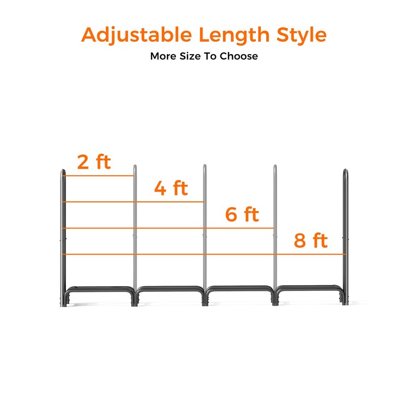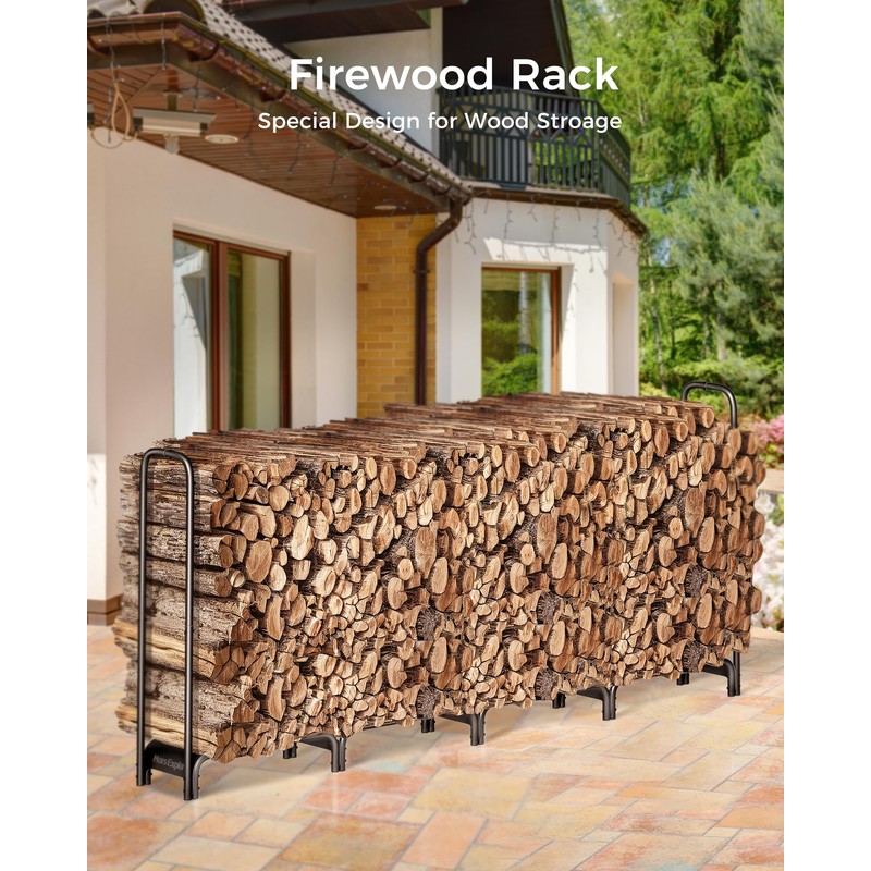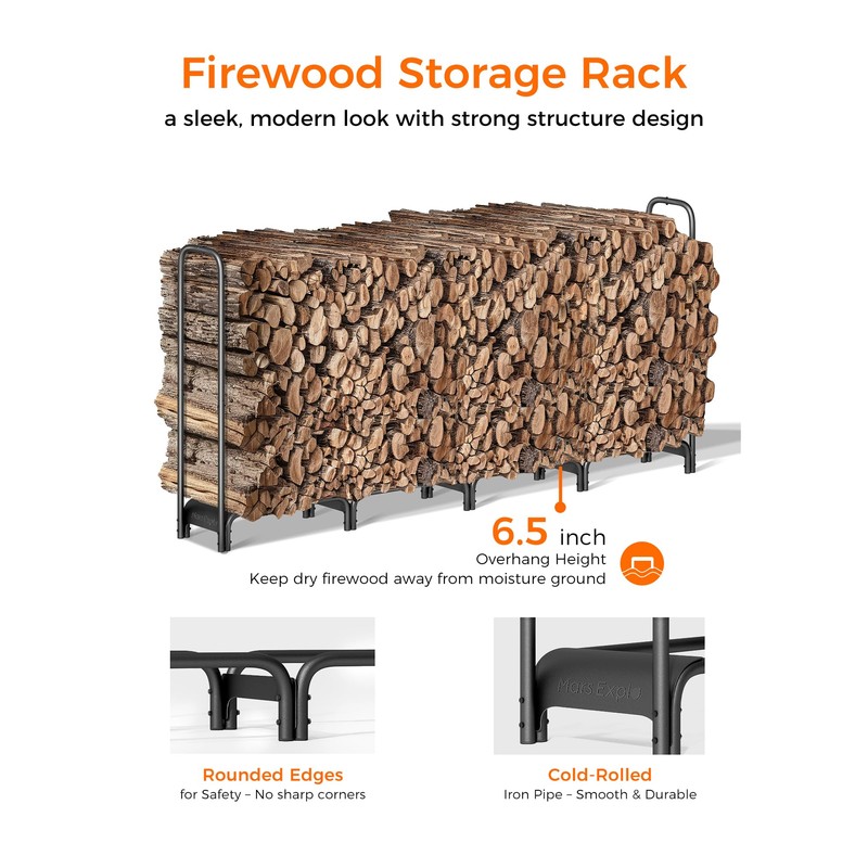 - HEAVY DUTY SAFE REINFORCED FRAME: The 8-foot firewood storage rack is made of heavy-duty tubular steel construction made of 1.2 mm thickened steel tubing with a double-layer black powder-coated finish, which is extremely durable, strong, rust-resistant, and weatherproof for complete all-weather protection. You can place it in any hot, cold, warm or dry climate and store enough firewood for your fireplace all year round.