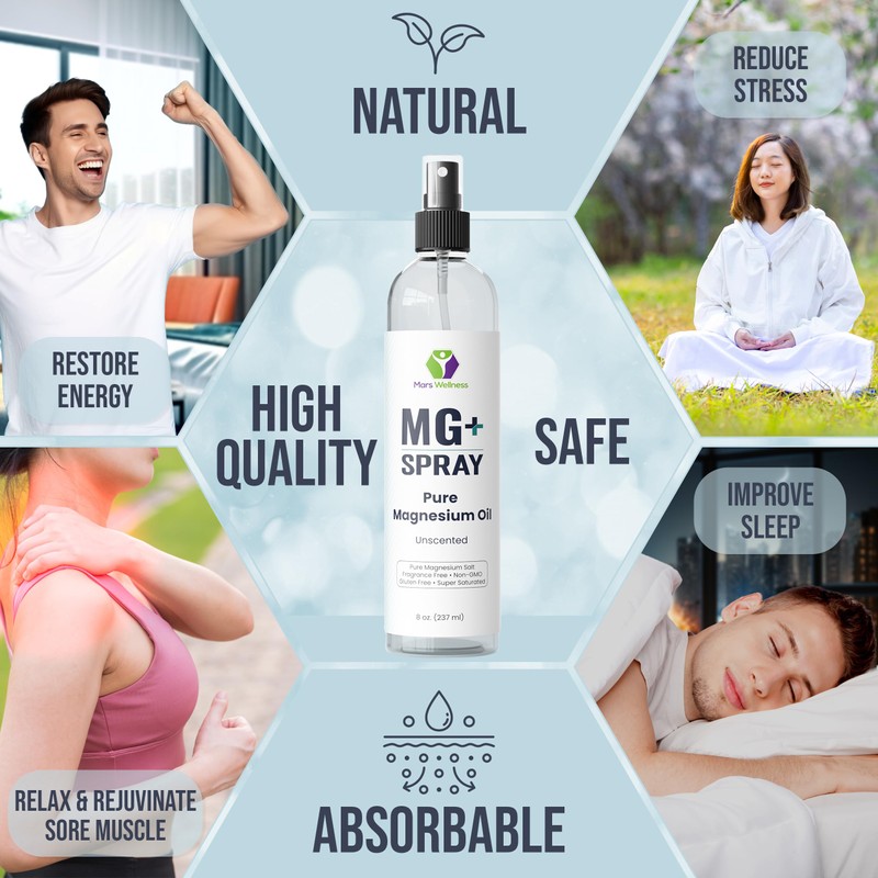 Mars Wellness MG+ Pure Magnesium Oil Spray - 8 Ounce Topical Magnesium Spray for Relaxing and Rejuvenating Muscles, Made in USA - Magnesium Spay
