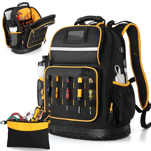 Marscamd Tool Backpack with Hard Bottom and a Tool Pouch, Heavy Duty Tool Bag with Multiple Pockets and Laptop Sleeve, Black