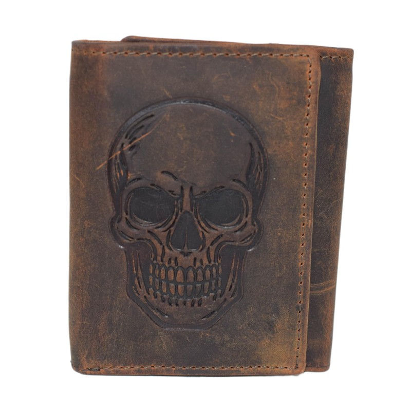 MARSHAL Men’s Genuine Leather Skull Wallet – Trifold RFID Blocking Biker Wallet with ID Window & Snap Closure (Brown No Chain)