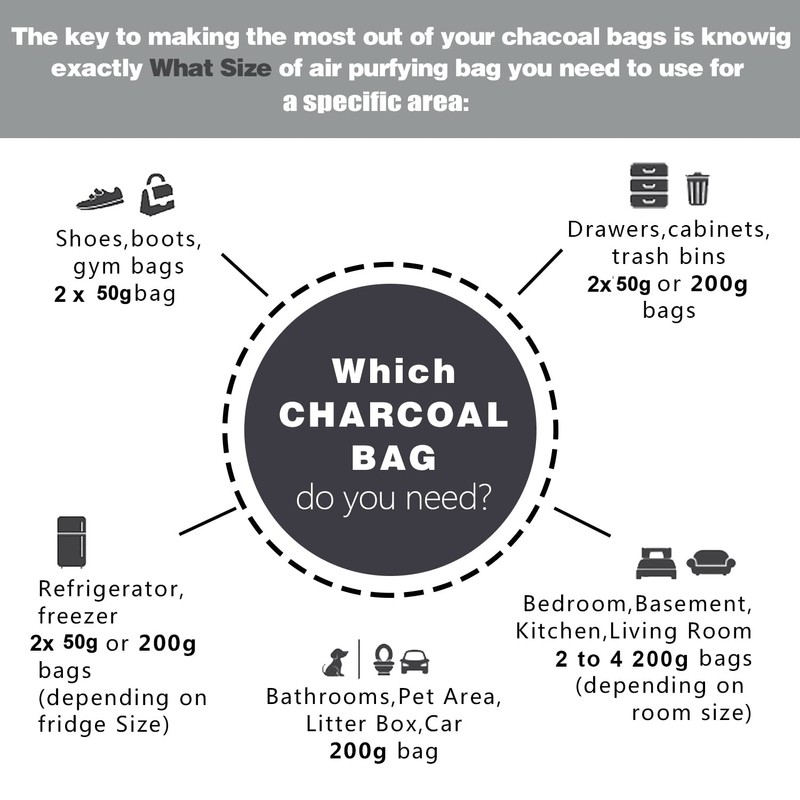 - Natural Charcoal Odor Absorber-Made of just one incredibly powerful natural ingredient-activated bamboo charcoal; The bamboo charcoal bags is continuously working to effectively absorb and remove odor , to clean and freshen the air.