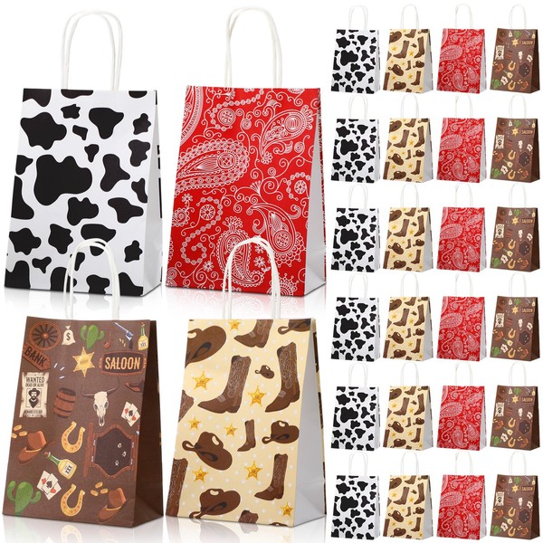 Marspark 24 Pcs Western Cowboy Party Favor Gift Bags Rustic Hat Boots Paisley Goodies Treat Paper Totes with Handle for Birthday Christmas Party, 4 Styles