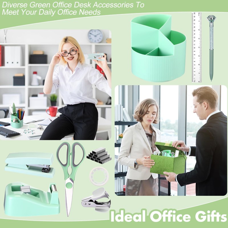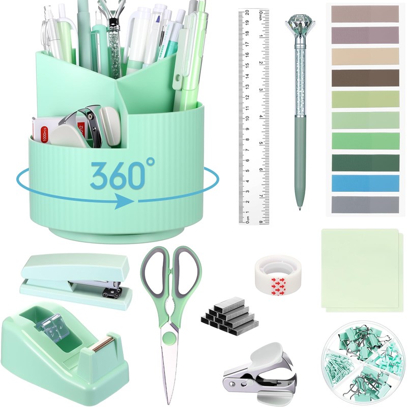 - Package Includes: our package includes 1 x 360-degree rotating pen holder, 1 x tape dispenser, 1 x stapler, 1 x scissor, 1 x staple remover, 1 x ballpoint pen, 1 x ruler, 1 x tape, 1 pack sticky notes, 1 pack translucent sticky tabs, 1 box of binder clips, 1 box of staples, diverse green office desk accessories to meet your daily office and study needs