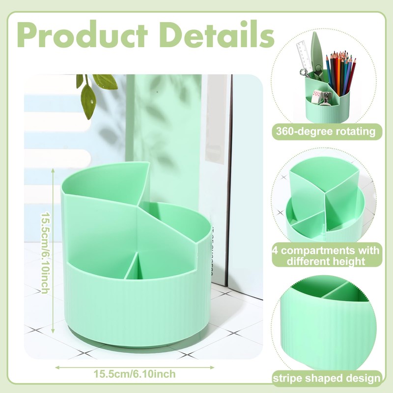 - 360° Rotation Design: designed for functionality, our green rotating pen holder can be rotated 360 degrees and divided into 4 compartments with different height, which makes it easy to separate and store a wide variety of items, provides ample storage room and keep your desktop clean and organized