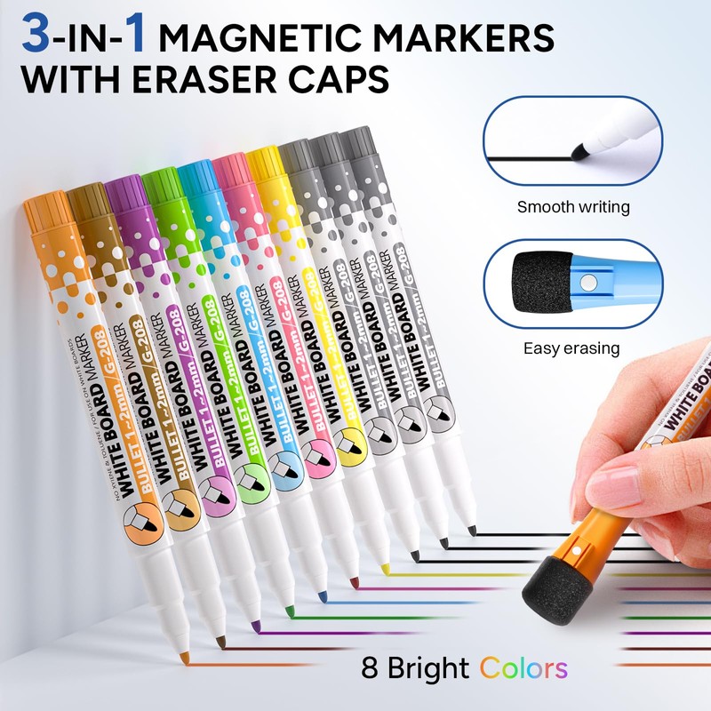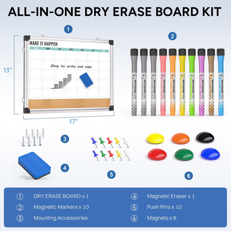 - Dry Erase Kit: This calendar board bundle contains 10 high-quality magnetic markers, including 7 vibrant colors and 3 classic black, 6 magnetic dots, 1 magnetic eraser, and 10 push pins. The bottom cork strip securely holds invoices, bills, memos, and photos using the included push pins