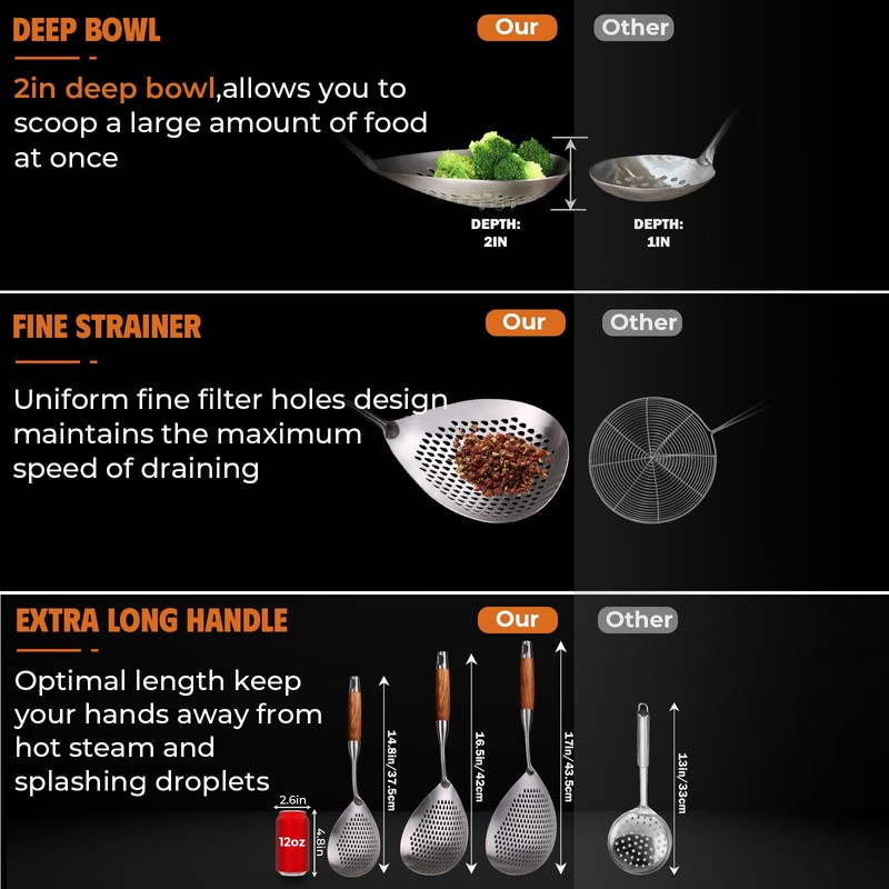 - Multiple Size - Set of 3 different skimmer strainers,total length: 14.8Inch, 16.5Inch and 17 inch,diameter: 4.3Inch, 5.1Inch and 5.8Inch,and depth is 2 inches.Multiple size options to meet the daily cooking needs of different foods